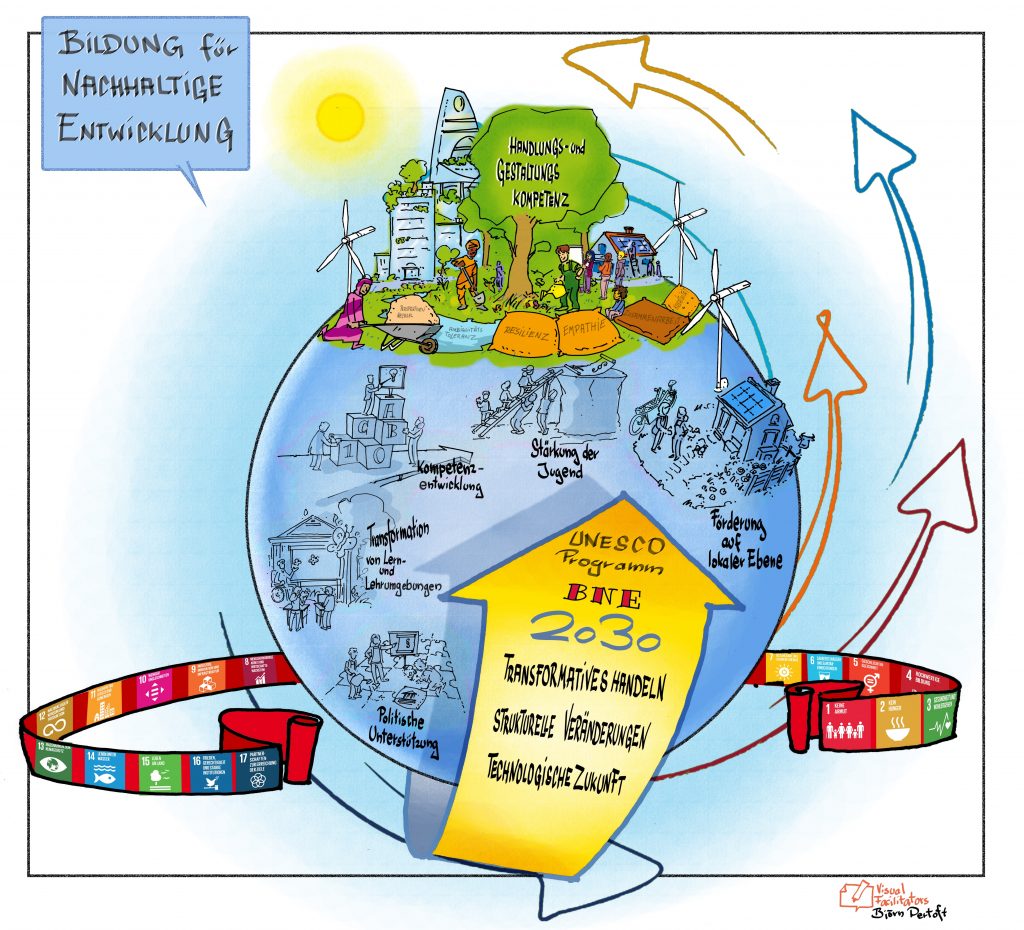 Wichtige Begriffe, welche im Zusammenhang mit BNE genannt werden, sind z.B. die Nachhaltigkeitsstrategie und die Agenda 2030. Das Bundesministerium für Bildung und Forschung (BMBF) beschreibt den Zusammenhang der Begriffe mit BNE wie folgend: „Bis 2030 sicherstellen, dass alle Lernenden die notwendigen Kenntnisse und Qualifikationen zur Förderung nachhaltiger Entwicklung erwerben, unter anderem durch Bildung für nachhaltige Entwicklung und nachhaltige Lebensweisen, Menschenrechte, Geschlechtergleichstellung, eine Kultur des Friedens und der Gewaltlosigkeit, Weltbürgerschaft und die Wertschätzung kultureller Vielfalt und des Beitrags der Kultur zu nachhaltiger Entwicklung“