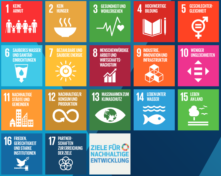 Darstellung der Ziele der BNE als 17 einzelne, farbige Kästchen